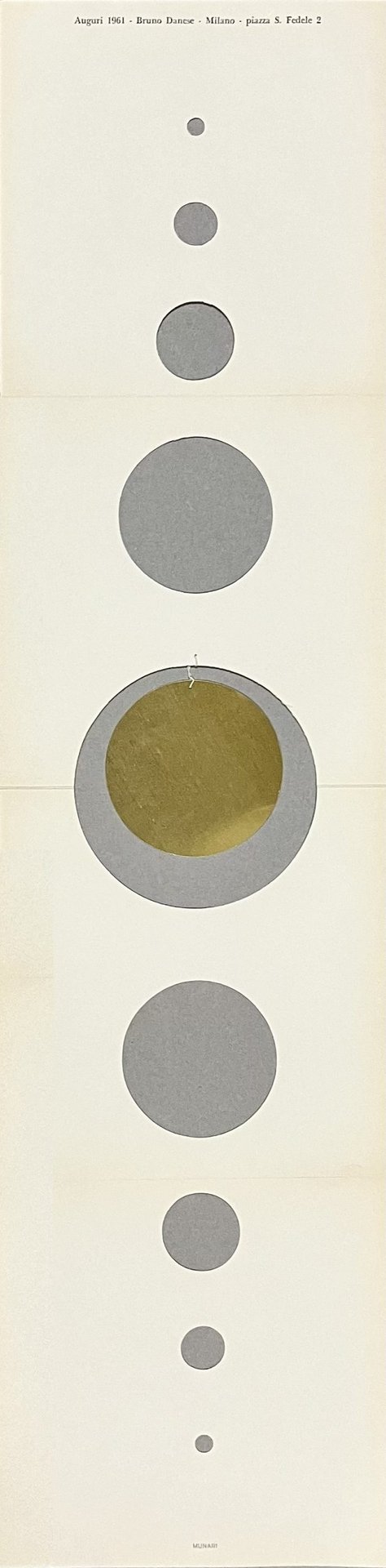 Cartoncino piegato in 4 parti con 9 fori fustellati e un disco dorato legato con cordoncino. Splendido biglietto di auguri realizzato per l'azienda Danese.