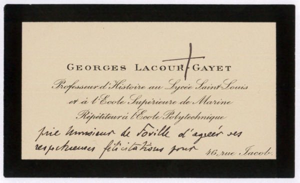 Visiting card format. 8 lines. To congratulate the statistician Alfred de Foville on the occasion of his election as perpetual secretary of the Académie des Sciences Morales et Politiques: "[Georges Lacour-Gayet] prie monsieur de Foville d'agréer ses respectueuses félicitations pour le légitime honneur qui vient de lui être fait par ses confrères de l'Académie. Il se permet de lui adresser le programme de son cours de cette année et il serait très heureux de continuer à avoir mademoiselle de Foville parmi ses aoditrices". - On lithogr. visiting card with mourning border.