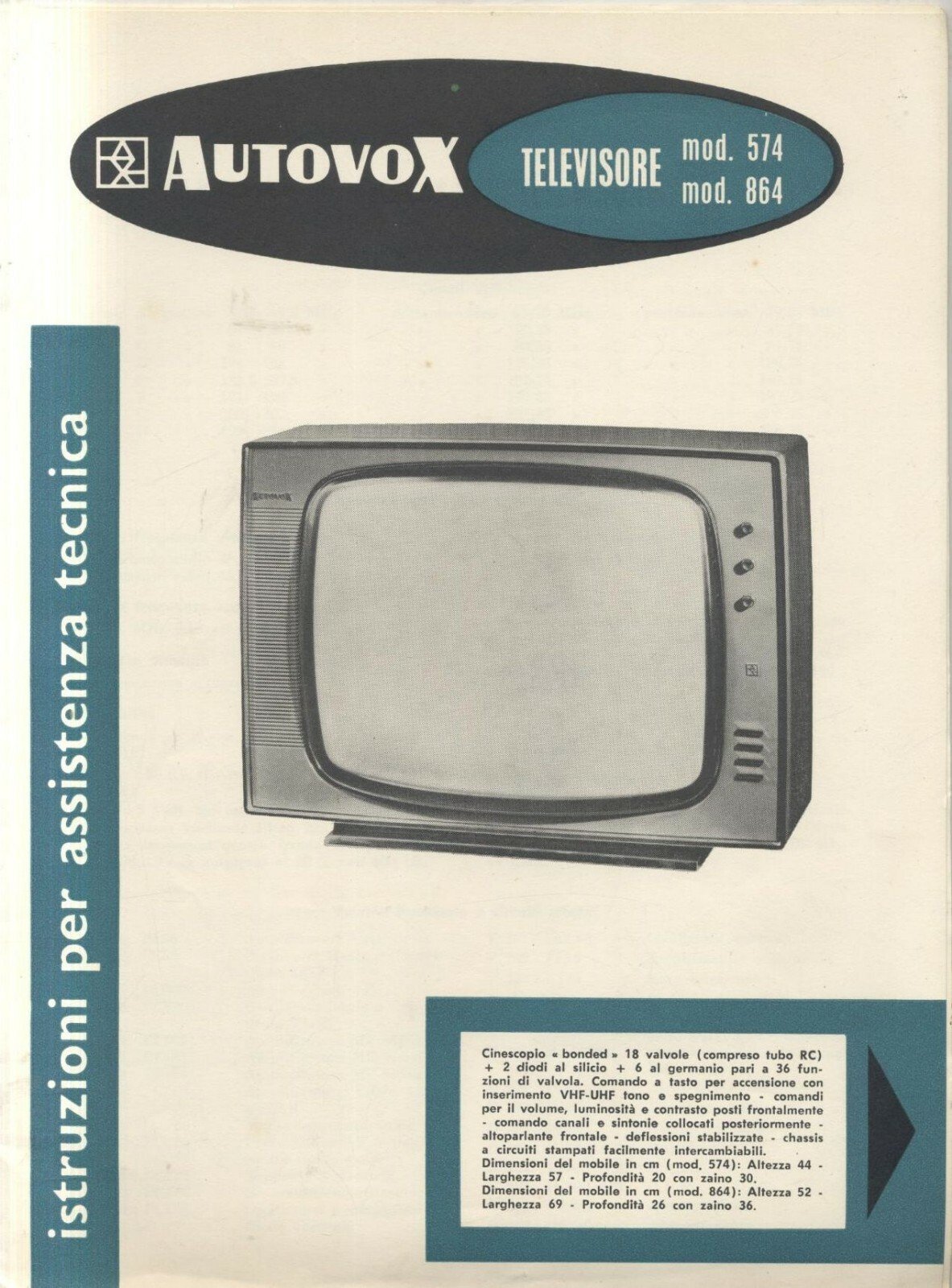 AUTOVOX televisore mod. 574 e 864. istruzioni per assistenza tecnica. presumibilmente fine anni '60 inizi '70.15 Pagine compreso il piatto anteriore 4 schemi elettrici e circuiti stampati su due tavole ripiegate.Copertina editoriale in brossura.Stato di conservazione: molto buono(pagine normalmente ingiallite, piccole imperfezioni alla copertina)