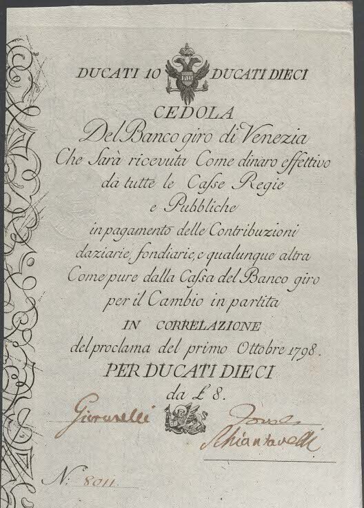 BANCO DEL GIRO DI VENEZIA CEDOLA DA 10 DUCATI 1798 -