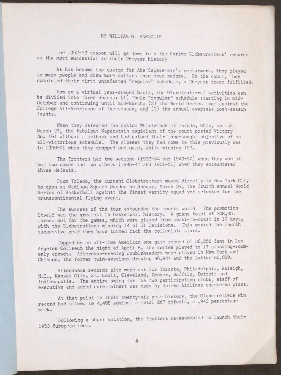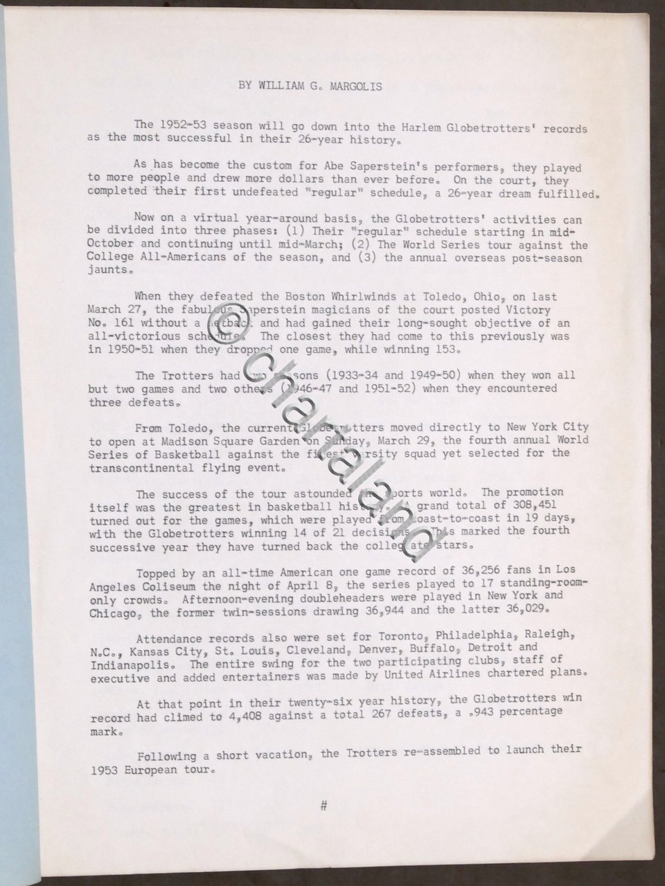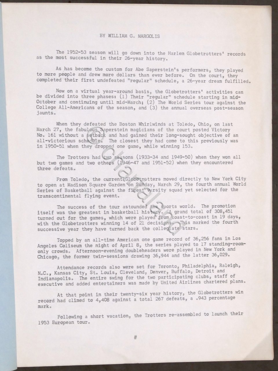 Basket Harlem Globetrotters - 1953 European Publicity Brochure Supplement