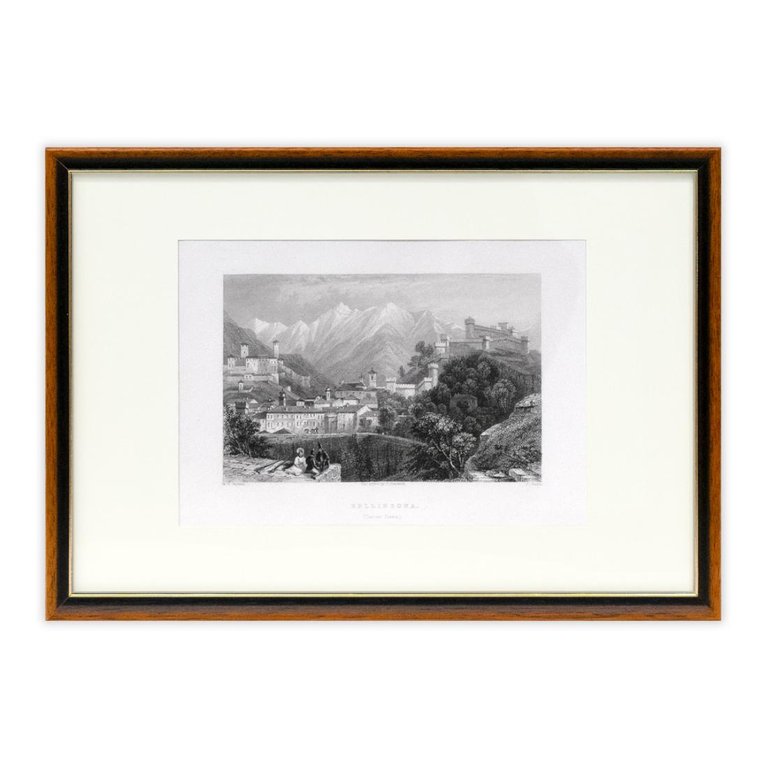 Bellinzona, Canton Tessin Autore: H. William Baartlett - Jhon SmithAnno: 1835Tecnica: Incisione su acciaioDimensioni: 37x26 cm (con cornice); 22,5x16 cm (netto incisione) Note: Bella veduta tratta dall'opera "Switzerland" di Beattie William illustrato da W.Bartlett, Londra 1835-36.Pubblicazione: Menzionata in diversi cataloghi specializzati fra cui "Il Ticino nelle vecchie stampe" di Giorgio Ghiringhelli n 468. Edizione Casagrande di Bellinzona.Inquadratura: Inquadrata con passepartout colore perla, foglio di laminil a protezione. Cornice di legno di noce. Ottime condizioni generali come da immagini.
