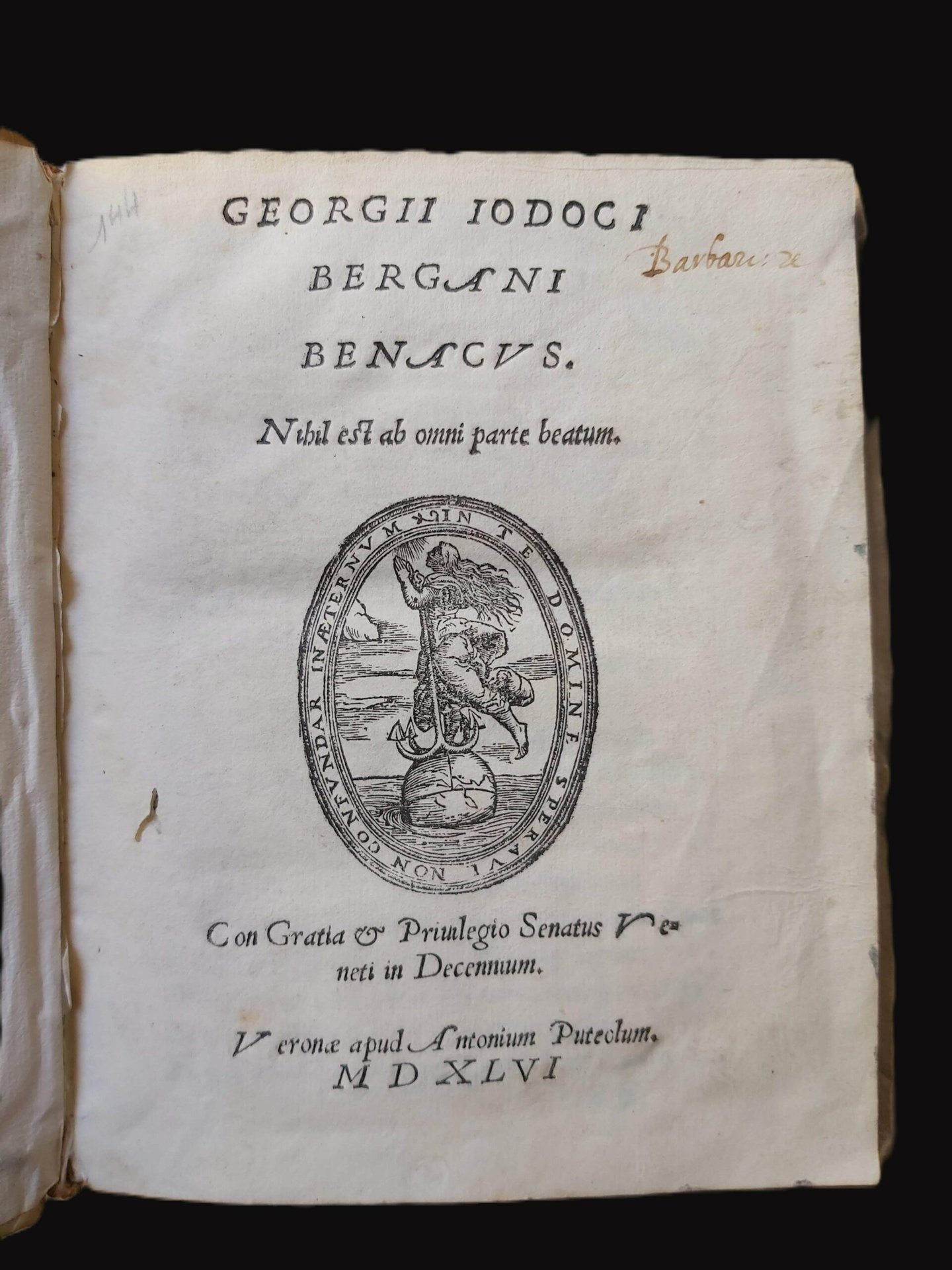 in-4 antico, cc 94 (mal numerate 92), leg. p. perg. rigida settecentesca con tass. in pelle al d. Tagli spruzzati. Bella vignetta in legno al front. Dedicat. a Cristoforo Mandruzzo. Una delle più antiche descrizioni del lago di Garda con i riferimenti ai paesi delle due sponde. L’autore è Jodocus da Berg (nel Brabante), monaco benedettino di San Zeno a Verona. Tra le altre cose, pare che il Berganus sia il primo a descrivere la fonte d'acqua sulfurea che scaturisce a circa 300 metri dalla riva di Sirmione: "aquae sulphurei odoris, iuxta Syrmionem in Benaco ebulliunt" (Solitro, Benaco, 1897, pag.37). Da “Il Garda”, dicembre 1927, pag.19: “E’ un poema in esametri latini, diviso in cinque libri, e canta le nozze del Benaco, primogenito di Nettuno cioè del mare, con la ninfa Carite (Garda) graziosa figlia del Baldo [.] Tutto l’Olimpo interviene alle nozze, e l’episodio è animato classicamente. Ma l’erudizione classica non soffoca il brio e l’ispirazione degli episodi, delle descrizioni, e dell’accenno alla glorie di Verona e del veronese ch’epi conosceva assai bene, avendovi l’abbazia beni per tutto". Indice delle località citate a c. 4 verso. Coleti 91: “Sebbene sia questo un poema, contiene nulladimeno tali particolarità sul Lago, che non istà male in questa serie di Storie”. Lozzi 348: “Raro”. Ceresoli p. 80: “. I canti IV e V sono dedicati in gran parte ai pesci del lago (carpione, sardina, trota, tinca, anguilla, ecc.), alle varie tecniche di pesca usate per ciascuno di essi,. e anche alla cattura delle allodole e dei tordi, con l’indicazione dei luoghi più favorevoli. Prima e rarissima edizione di questo poema didascalica, l’unico tra gli antichi che tratti della pesca e dei pesci del Benaco”. Manca come sempre la carta topogr. del lago di Garda, qui fornita in fotocopia per documentazione. Ultime 8 cc con brunitura uniforme. Picc. lavoro di tarlo al front. Bell’esempl. [521]