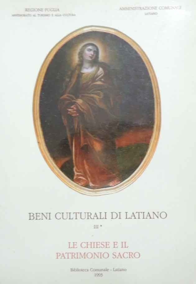 Beni culturali di Latiano. Volume terzo. Le Chiese e il patrimonio sacro. Tomo primo, a cura della Biblioteca Comunale – Latiano, Biblioteca Comunale, Latiano 1993, pp. 367, ill. b.n., 8 c. di tavv. f.t. ill. col., cm 24, br. ed. In testa al frontespizio: Regione Puglia, Assessorato al Turismo e alla Cultura – Amministrazione Comunale, Latiano. Coordinatore: Antonio Benvenuto. Schede: Franca Lotesoriere e Margherita Rubino. Fotografie: Antonio Nacci. Rilievi e disegni: Salvatore Madaghiele e Fernando Scarafile. Minima brunitura di carta e brossura, per il resto perfetto.