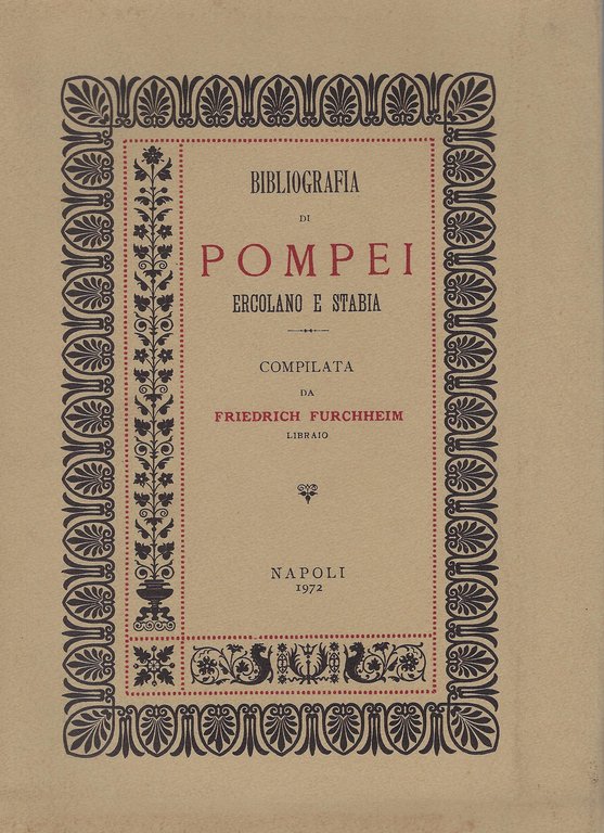 L. Regina, 1972. Collana Bibliotheca POmpeiana. Ristampa anastatica della II edizione riveduta e notevolmente aumentata, Napoli: F. Furchheim, 1891. EDizione di esemplari numerati, esemplare n. 689, 118 pp. brossura Ottimo (Fine) bordo inferiore della copertina leggermente sciupato, alcune fioriture sui tagli, pagine come nuove e intonse.