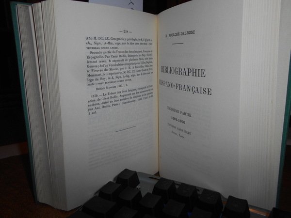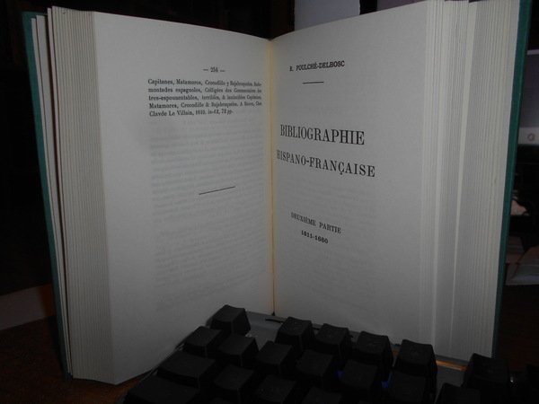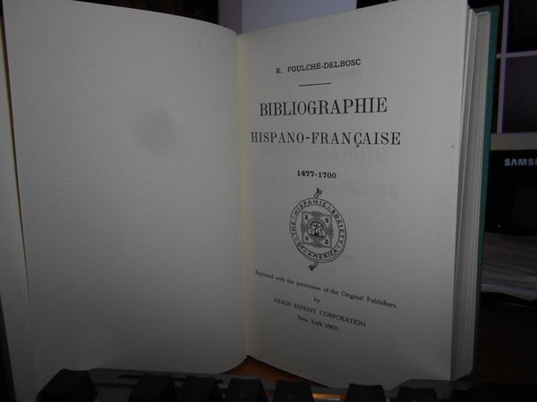 R. Foulché-Delbosc. New York, Kraus Reprint Coropration, 1962. BIBLIOGRAPHIE Hispano-Française 1477-1700. Reprint. 3 parti in un volume in-16°, tela verde con titolo in oro al dorso. (3), 254, 218, 227 pp. Come nuovo. Uff. F - 6