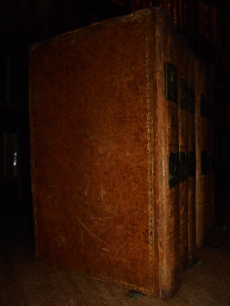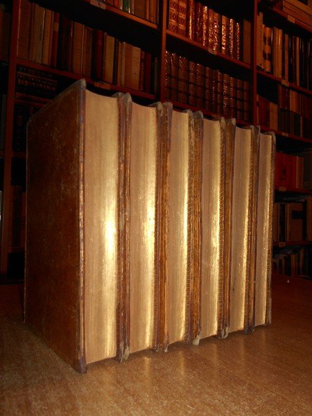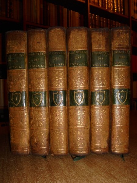 Par G. BOUCHER de la Richarderie. Paris, Chez Treuttel et Wurtz, Ancien Hotel de Lauraguais, 1808. Bibliothèque Universelle des VOYAGES ou Notice complète et raisonnée de tous Voyages anciens et modernes dans les différentes parties du monde, publiés tant en langue française qu'eu langues étrangères. Prima edizione. 6 volumi in-16°, piena pelle coeva con cornici dorate sui piani, dorsi con fregi e titoli in oro, tagli dorati. I. xxx, 495 pp. II. vij, 551 pp.; III. vij, 503 pp.; IV. vij, 542 pp.; V. vij, 527 pp.; VI. viij, 485 pp. Ottimo esemplare con lievi bruniture sparse. Uff. F - 1 - Uff. F - 1