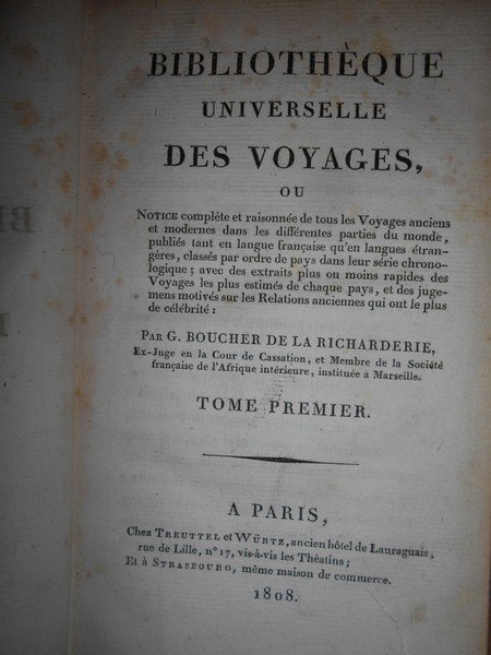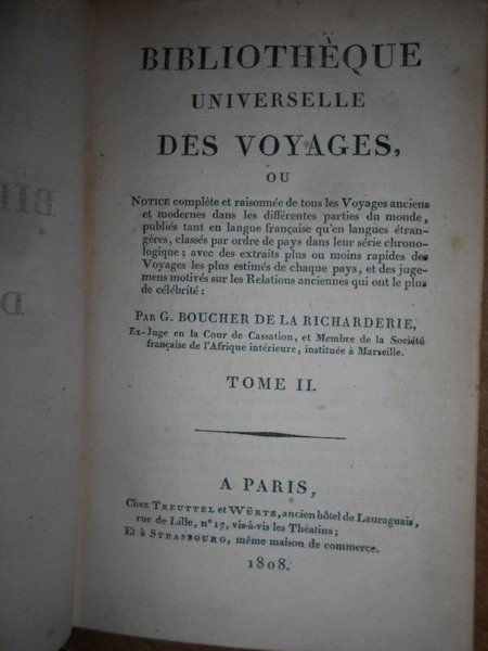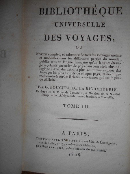 Bibliothèque Universelle des VOYAGES ou Notice complète et raisonnée de tous Voyages anciens et modernes dans les différentes parties du monde, publiés tant en langue française qu'eu langues étrangères. | Livres anciens et modernes | Par G. Boucher De La Richarderie