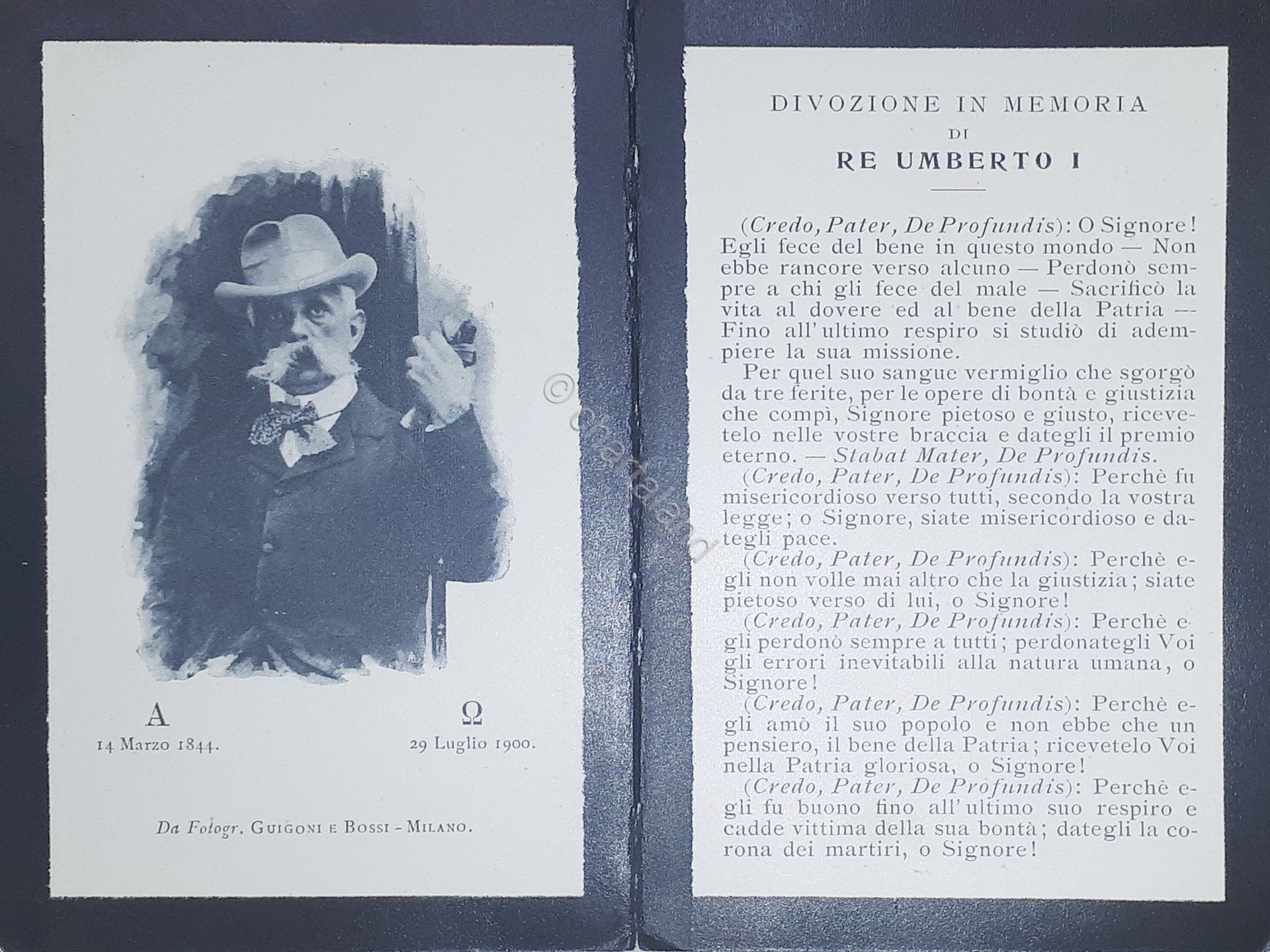 Biglietto Commemorativo Religioso - Divozione in memoria di Re Umberto I - 29 Luglio 1900 Testo in lingua italiana. Pag. 2 Dimensioni aperto 12 x 15.5 cm Condizioni ottime Umberto I di Savoia (Umberto Rainerio Carlo Vittorio Emanuele Giovanni Maria Ferdinando Eugenio di Savoia; Torino, 14 marzo 1844 – Monza, 29 luglio 1900) è stato Re d'Italia dal 1878 al 1900. Figlio di Vittorio Emanuele II, primo re d'Italia, e di Maria Adelaide d'Austria, regina del Regno di Sardegna, morta nel 1855, il suo regno fu contrassegnato da diversi eventi, che produssero opinioni e sentimenti opposti.