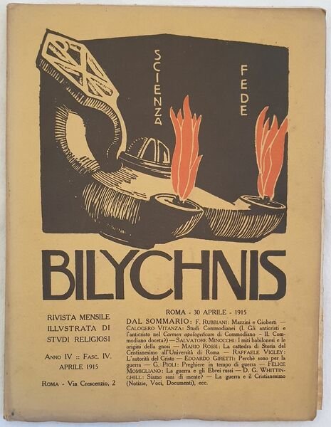 Numero del aprile 1915 della rivista mensile di studi religiosi "Bilychnis" pubblicata tra il 1912 e il 1930. All'interno: Mazzini e Gioberti, Studi commodianei (Gli anticristi e l'anticristo nel Carmen apologeticum di Commodiano), I miti babilonesi e le origine della gnosi, La cattedra di storia del Cristianesimo all'Universita di Roma, Preghiere in tempo di guerra, La guerra e gli ebrei russi, Siamo sani di mente? La guerra e il cristianesimo ecc. Qualche planche all'interno. In discrete condizioni. Copertina editoriale in buone condizioni generali con lievi usure ai margini e dorso. Legatura in discrete condizioni con rotture. Pagine in discrete condizioni con fioriture. In 8. Dim. 25,5x19,5 cm. Pp. da 261 a 336. Number of april 1915 of the monthly magazine of religious studies "Bilychnis" published between 1912 and 1930. Inside: Mazzini and Gioberti, Studi commodianei (Antichrist and the antichrist of Carmen apologeticum of Commodiano), Babylonia and origin of gnosi, History of Christianism in the University, Prayer during war time, War time, War and Christianism etc. Some plates inside. In fair conditions. Editorial cover in good general conditions lightly worn in the extremities. Binding in fair conditions with cracks. Pages are in fair conditions with foxings. In 8. Dim. 25,5x19,5 cm. Pp. from 261 to 336.
