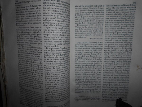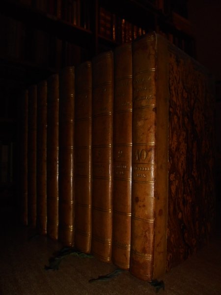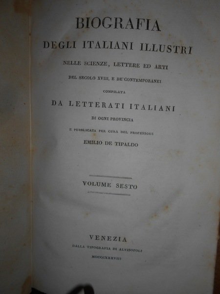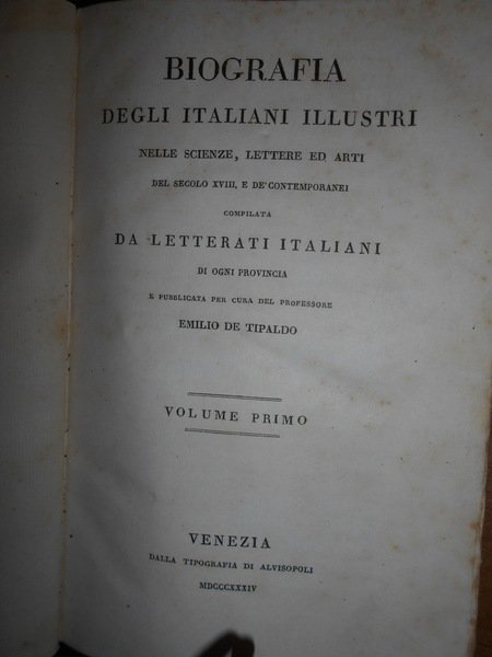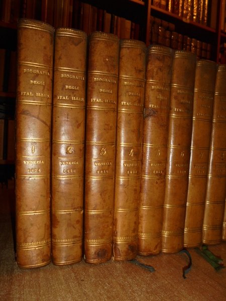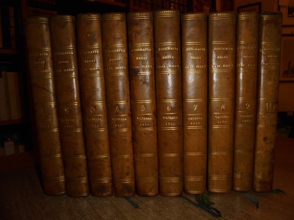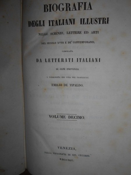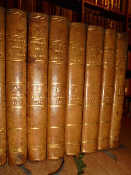 Emilio, Tipaldo. Venezia, Dalla Tipografia di Alvisopoli, 1834/1845. BIOGRAFIA degli Italiani Illustri nelle Scienze, Lettere ed Arti del Secolo XVIII, e de' contemporanei compilata da letterati Italiani di ogni provincia e pubblicata. Edizione originale. 10 volumi in-8°, m. pelle coeva con titoli e fregi in oro ai dorsi. xvi, 495, (1) pp.; 512 pp.; 511, (1) pp.; 511, (1) pp.; 512 pp.; 512 pp.; xvi, 495 pp.; 512 pp.; (viii), 374, (2) pp.; 382 pp. Bellissimo esemplare con ex Libris al verso del piano anteriore del primo volume. Uff. A - I - 2