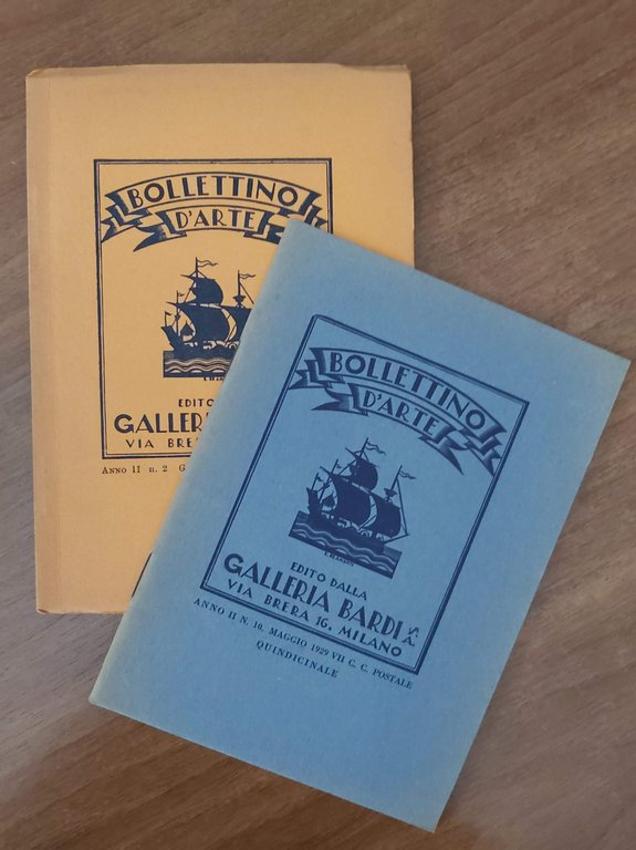 2 voll. in-16, di pp.30/40 cad., bross. edit. con cop. xilogr. di E. Bramanti. Con tavv. Sono 2 bollettini della rivsta d'arte pubblicata dalla Galleria milanese, con uscita quindicinale, che contiene recensioni e scritti d'arte: numero 2 gennaio 1929 e numero 10 maggio 1929. In particolare sono contenuti saggi sugli artisti Bepi Fabiano, Agostino Fossati, Casimiro Jodi, Franco Lombardi, Antonio Moretti, Filippo Maliavine, e altri. Lievi tracce di usura su qualche tav. [416]