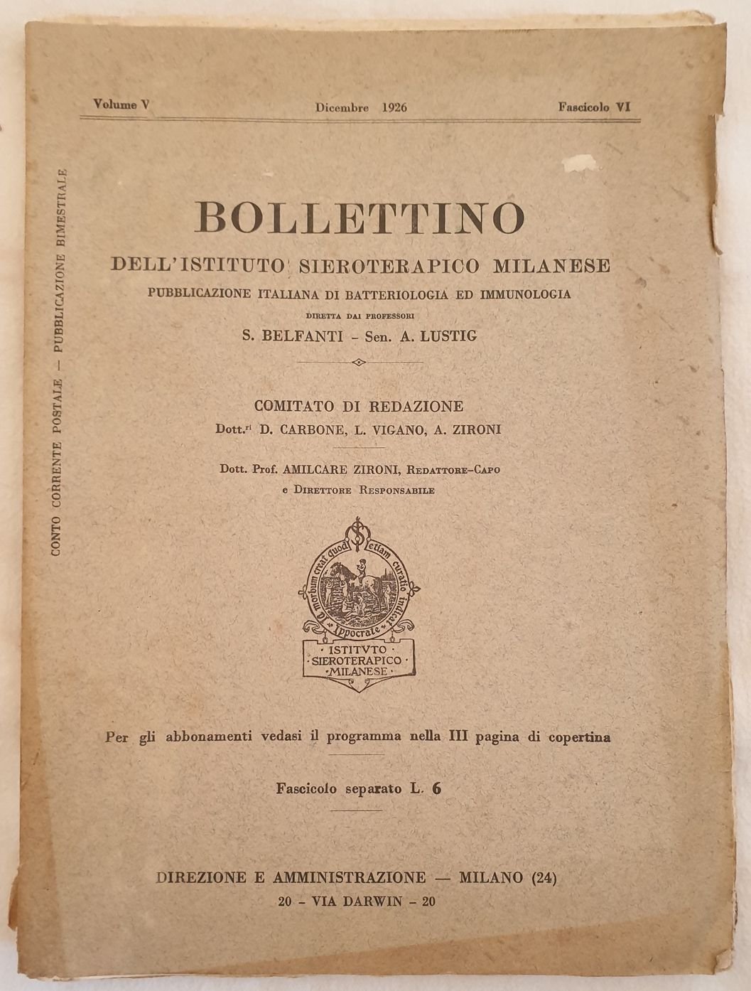 BOLLETTINO DELL'ISTITUTO SIEROTERAPICO MILANESE DICEMBRE 1926 | Livres anciens et modernes | S. Belfanti - Sen. A. Lustig