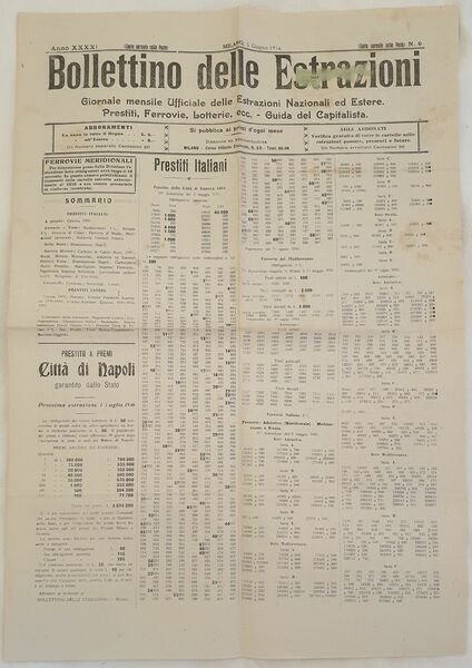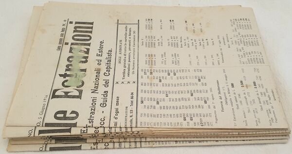 Raccolta completa dell'anno 1916 del giornale mensile "Bollettino delle Estrazioni". Fondato nel 1876 da Ferdinando Bocconi e Angelo Brambilla con un formato tipo Gazzetta Ufficiale pubblicava l’elenco dei titoli di debito del Regno d’Italia rimborsati a estrazione, tutte le operazioni più importanti del mercato azionario, obbligazionario, dei titoli di Stato e dei fondi. La rivista è tuttora pubblicata con il nome di "Il Bollettino". In buone condizioni Copertina editoriale in buone condizioni generali con lievi usure ai margini e dorso. Pagine in buone condizioni con fioriture. Ogni rivista è ripiegata in quattro parti.In 8. Dim. 25,5x18 cm. Pp. (4) cad. Complete collection of the year 1916 of the monthly magazine "Bollettino delle Estrazioni".<BR><BR>Established in 1876 by Ferdinando Bocconi and Angelo Brambilla with a format Gazzetta Ufficiale published the list of titles of debts of Regno d’Italia all the most important happenings of stock market. The magazine is still published with the name "Il Bollettino". In good conditions. Editorial cover in good general conditions lightly worn in the extremities. Pages are in good conditions with foxings. Each magazine is bound into four parts In 8. Dim. 25,5x18 cm. Pp. (4) cad.