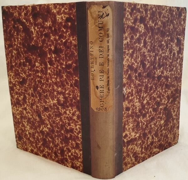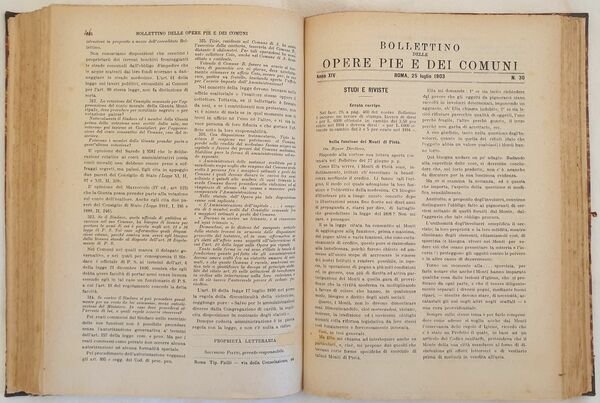 Annata del 1903 del "Bollettino delle Opere Pie e dei comuni" La raccolta è formata da 48 numeri comprendenti dal numero 1 del 3 gennaio 1903 al numero 48 del 28 novembre 1903. All'interno: Articoli (Ospizi dei vecchi in Danimarca e Russia, Colonie di benefattori in Inghilterra, Manicomi in Italia, Monte di Pietà di Udine, Istituti a Roma: Conservatorio di S. Eufemia, Santa Maria degli Angeli, San Michele, Conservatorio della Divina Provvidenza, Casa di Carità di Sant'Agata dei Goti, Ospizio di Santa Margherita a santa Balbina, Per gli orfani del Segretario Comunale, Ricovero in un manicomio, il costo giornaliero dei malati nel Manicomio di REggio Emilia, Vigilanza sull'allattamento mercenario, Festa del risparmio a Firenze, istituti per l'infanzia abbandonata a Padova, Case di correzione, La reclusione degli alienati nei Manicomi e le disposizioni elgislative toscane, Gli ospizi marini e la scelta dei fanciulli, La tutela delgi esposti nelal legislazione italiana ecc.), Circolari del Ministero, Cronaca della Beneficienza e dei comuni ecc. In buone condizioni. Copertina in mezza tela con titolo al dorso in buone condizioni con lievi usure ai margini e dorso. Legatura in buone condizioni. Pagine in buone condizioni con rare fioriture. Pagina III risulta mancante. Piegatura verticale. In 4. cm 28x20. Pp. XLVII+768. Colelction of the year 1903 of the "Bollettino delle Opere Pie e dei comuni" The colelction is made up of 48 numbers from n. 1 of the 3rd of january 1903 tot he number 48 of the 28th of november 1903. Inside articles: (Hospice in Denmark and Russia, MentalHospitals, Monte di Pietà di Udine, Istituti a Roma: Conservatorio di S. Eufemia, Santa Maria degli Angeli, San Michele, Conservatorio della Divina Provvidenza, Casa di Carità di Sant'Agata dei Goti, Hospice of Santa Margherita a santa Balbina, For Horphans of Segretario Comunale, Mental hospital of REggio Emilia, Festa del risparmio in Florence, istituti per l'infanzia abbandonata in Padova, Correction houses, Mental houses and Tuscan law, ecc.), Circolari del Ministero, Cronaca della Beneficienza e dei comuni ecc. In good conditions. Half cloth cover with title in the back in good general conditions lightly worn in the extremities . Binding in good conditions. Pages in good conditions with foxings. Page III lacks. Vertical folding. In 4. cm 28x20. Pp. XLVII+768.