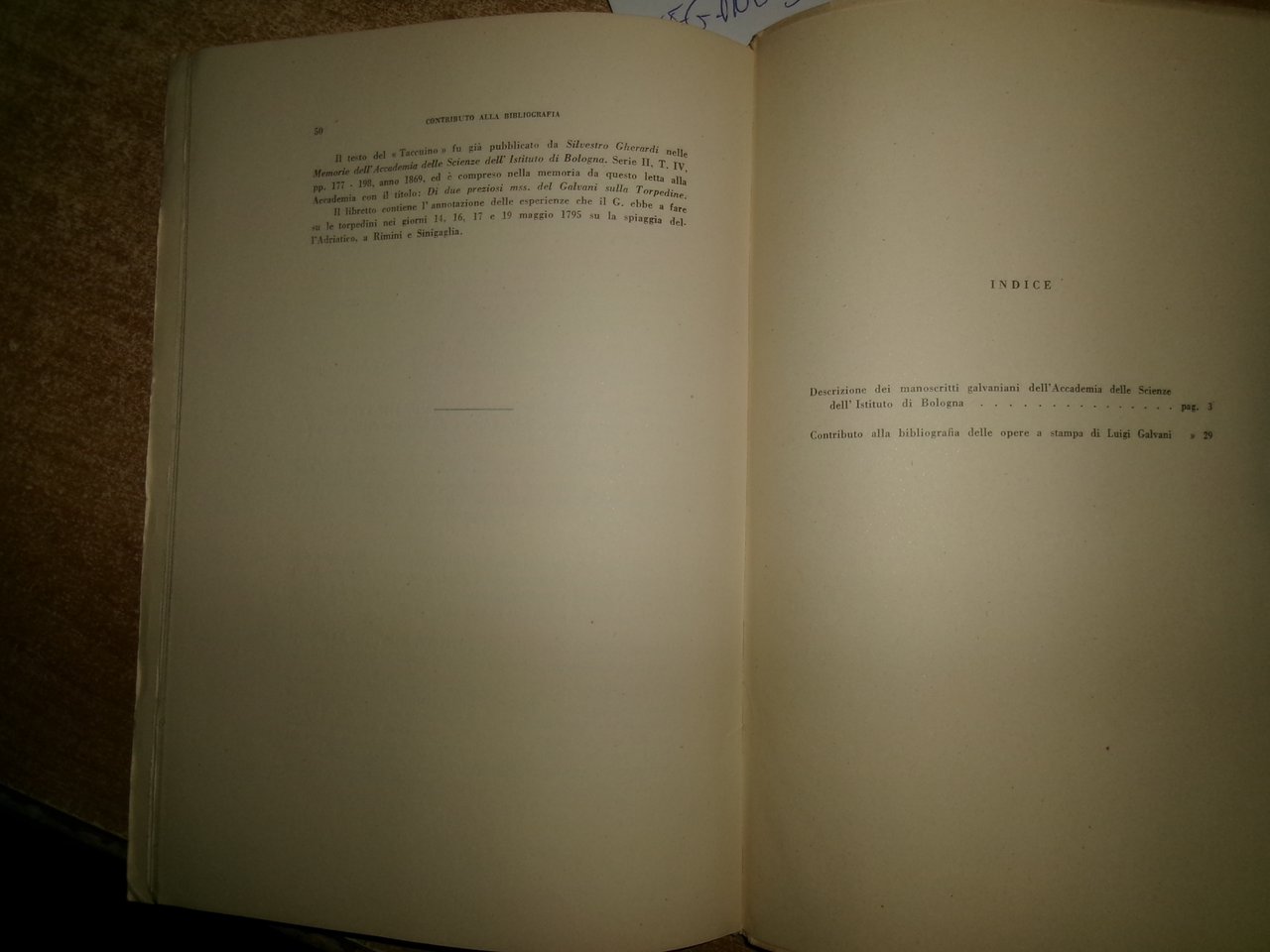 (BOLOGNA) Descrizione dei manoscritti Galvaniani dell' Accademia delle Scienze dell' Istituto di Bologna e contributo alla bibliografia delle opere a stampa di Luigi Galvani. Bologna, Licinio Cappelli Editore, 1937. In-8°, br. orig. con ex libris applicato al verso del piano anteriore. 50, (1) pp. Ottimo stato. Neg. mob. S in busta trasp.