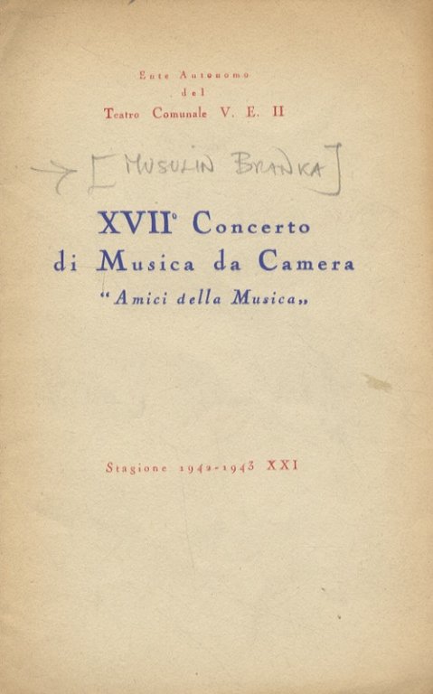 Branka Musulin (pianista). XVII° Concerto di Musica da Camera "Amici della Musica": Sala Bianca di Palazzo Pitti, sabato 13 febbraio 1943, ore 16. (Programma: J.S. Bach, D. Scarlatti, C. Franck, M. Ravel, F. Chopin). | Livres anciens et modernes | (Musulin Branka).