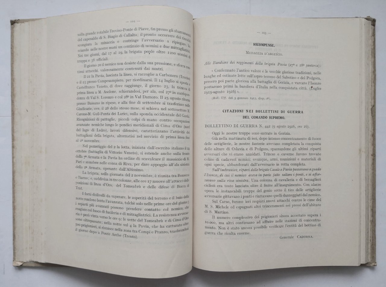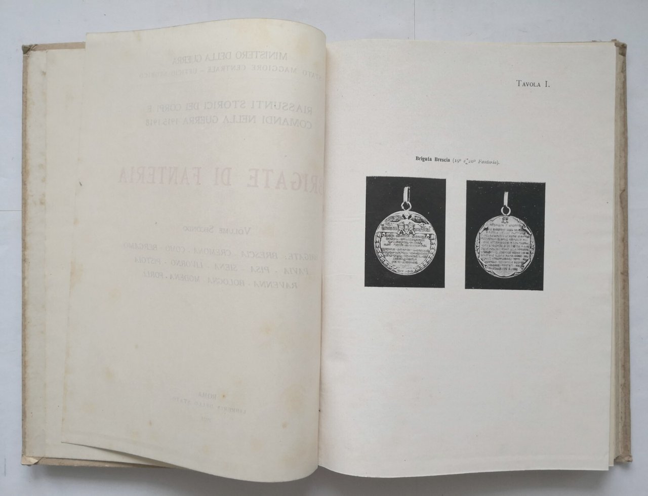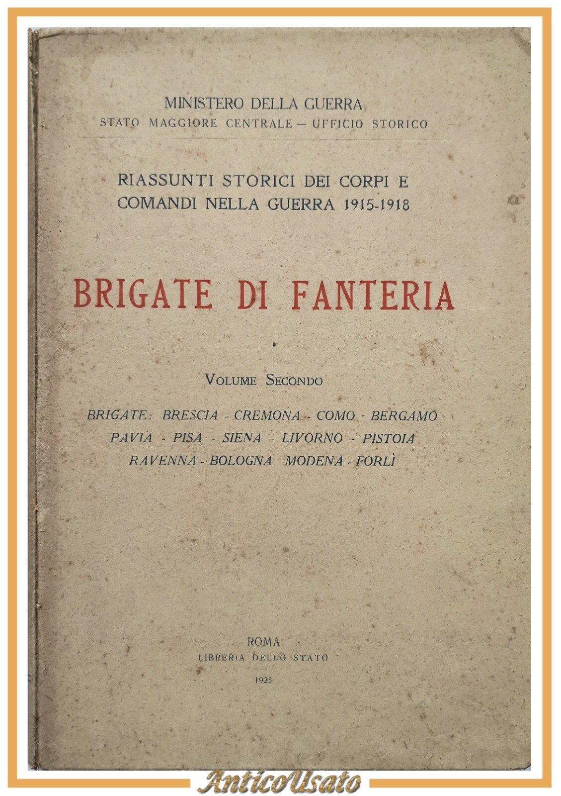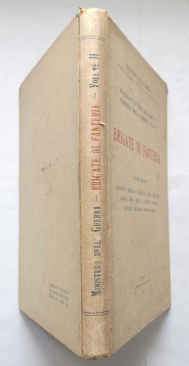 BRIGATE DI FANTERIA. Riassunti storici dei corpi e comandi nella guerra 1915-1918. Volume II brigate: Brescia, Cremona, Como, Bergamo, Pavia, Pisa, Siena, Livorno, Pistoia, Ravenna, Bologna, Modena, Forlì. Ministero della Guerra, Stato Maggiore Centrale - Ufficio Storico.