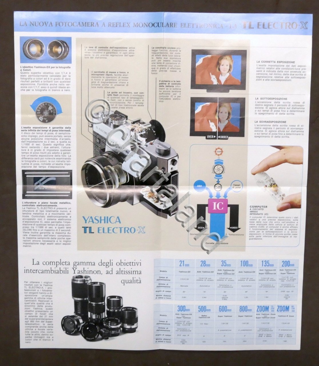 Brochure pieghevole - Yashica TL Electro X - 1970 Dimensioni aperta: 36 x 42 cm ca. Lingua italiana. Condizioni molto buone.