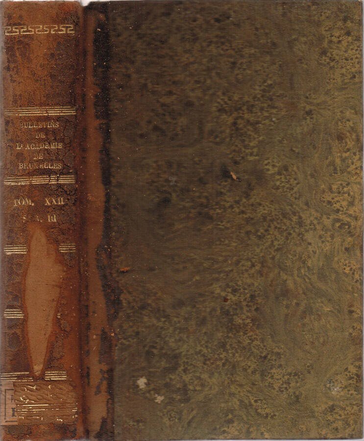 Anno 1891 incompleto, presenti i fascicoli da luglio a dicembre, Tomo XXII, anno LXI del periodico mensile Bulletins de l'Académie Royale des Sciences, des Lettres et des Beaux-Arts de Belgique - 3.me série. Volume della fine dell'800 in stato discreto, coperta in mezzapelle con angoli, piatti marmorizzati, sul dorso elementi decorativi e caratteri incisi in oro, diversi segni del tempo, fioritura sparsa, tagli bruniti con barbe, pagine in buono stato, margini appena ambrati, alcune leggermente ambrate con presenza di gora, ultima pagina in parte saldata alla controguardia. Presenta talloncino in carta con catalogazione bibliotecaria su risguardia; illustrazioni in b. e n. in testo e fuori testo. Numero Pagine 604