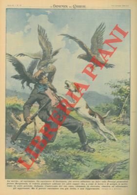 Cacciatore assalito da tre falchi che volevano vendicare il compare precedentemente ucciso.