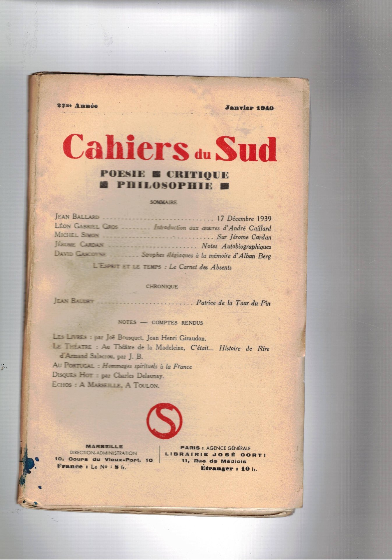 Cahiers du Sud. mensile Poesia, critica filosofia. n° di janvier. 1940. M. Simon Sur Jerome Cardan; J. Ballard 17 décembre 1939; ecc.