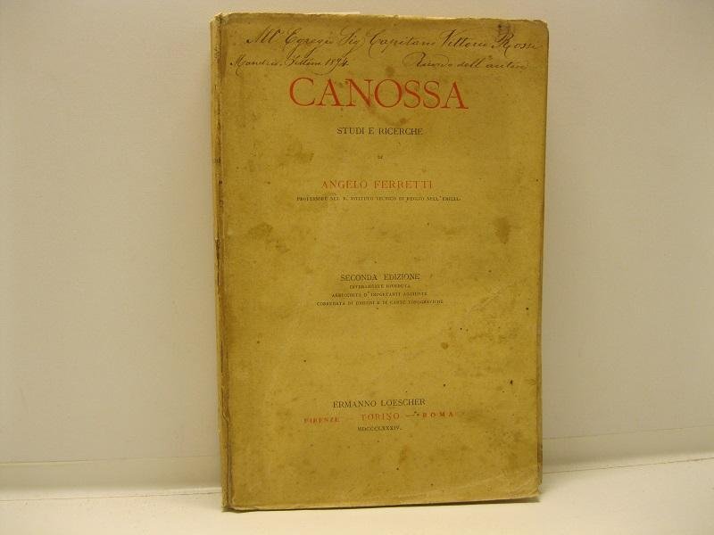 In 8, pp. 240 con 4 tavv. f.t. in lit. di cui 2 piu' volte rip. (planimetria e itinerario da Reggio a Canossa) le altre 2 raff. la celebre rocca. Br. ed. legg. polverosa con dedica aut. dell'a. Importante saggio pubblicato per la prima volta nel 1876 e in questa seconda edizione notevolmente arricchita, anche alla luce degli scavi effettuati dal gruppo degli alpinisti reggiani tra il 1877 e il 1880. Notevole la bibliografia premessa all'opera.