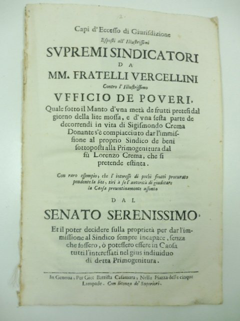 Capi d'eccesso di giurisdizione esposti all'Illlustrissimi supremi sindicatori da MM. fratelli Vercellini contro l'illustrissimo Ufficio de Poveri quale sotto il manto d'una meta' de frutti pretesi dal giorno della lite mossa.