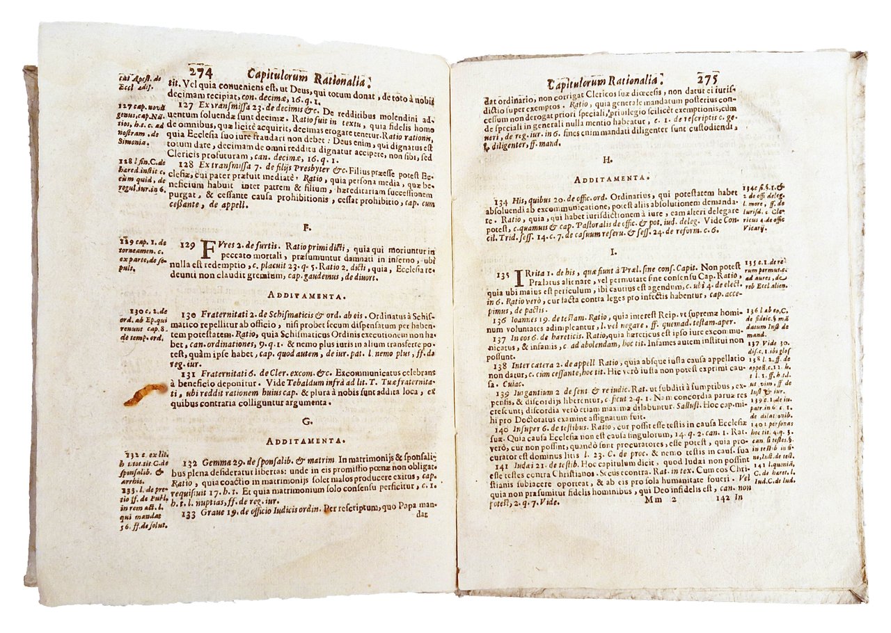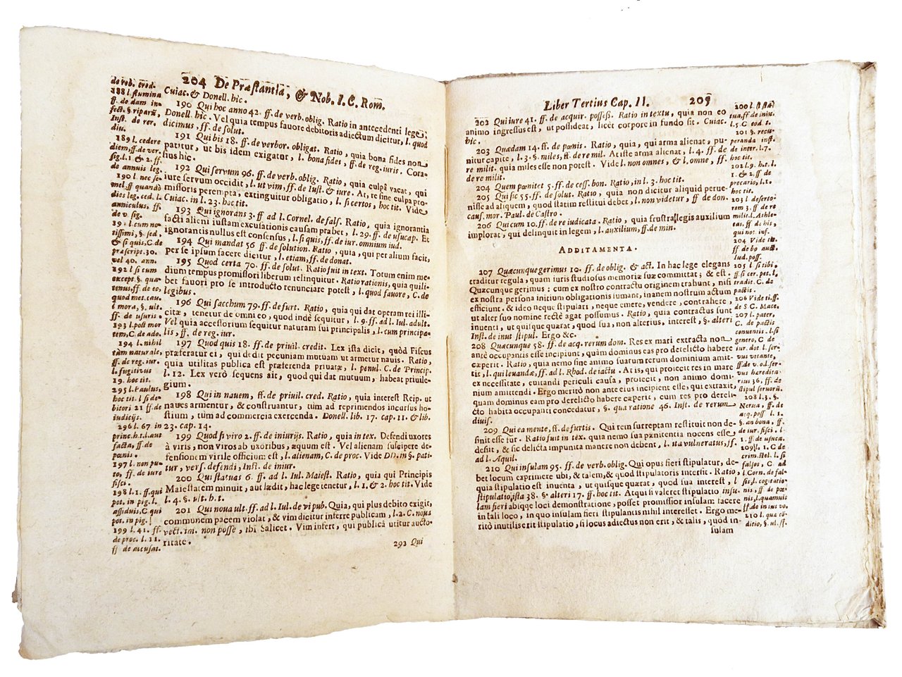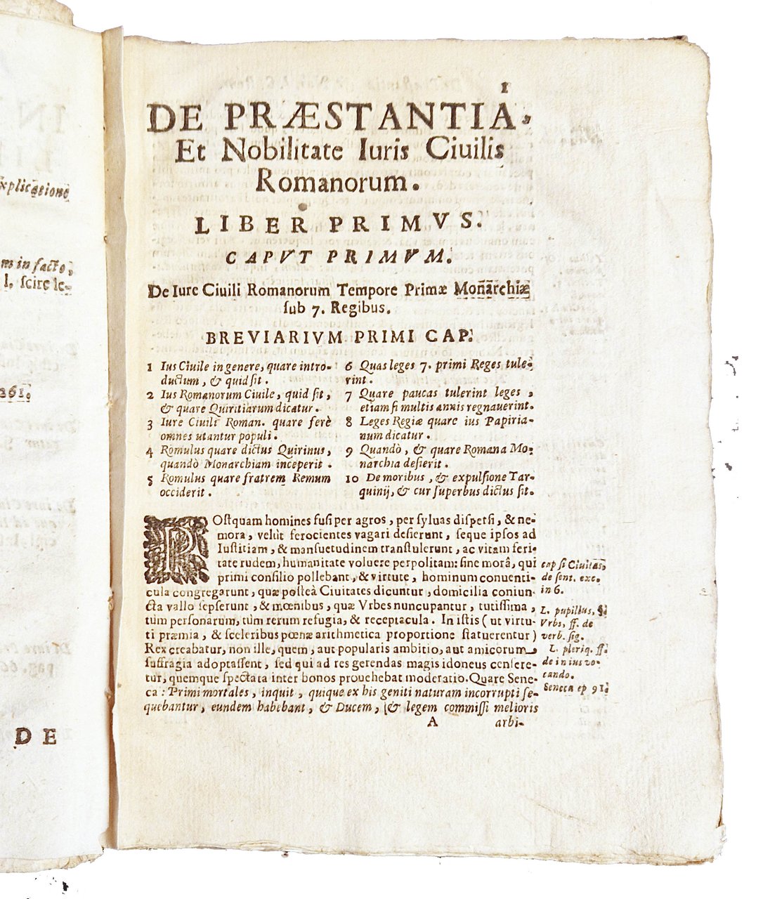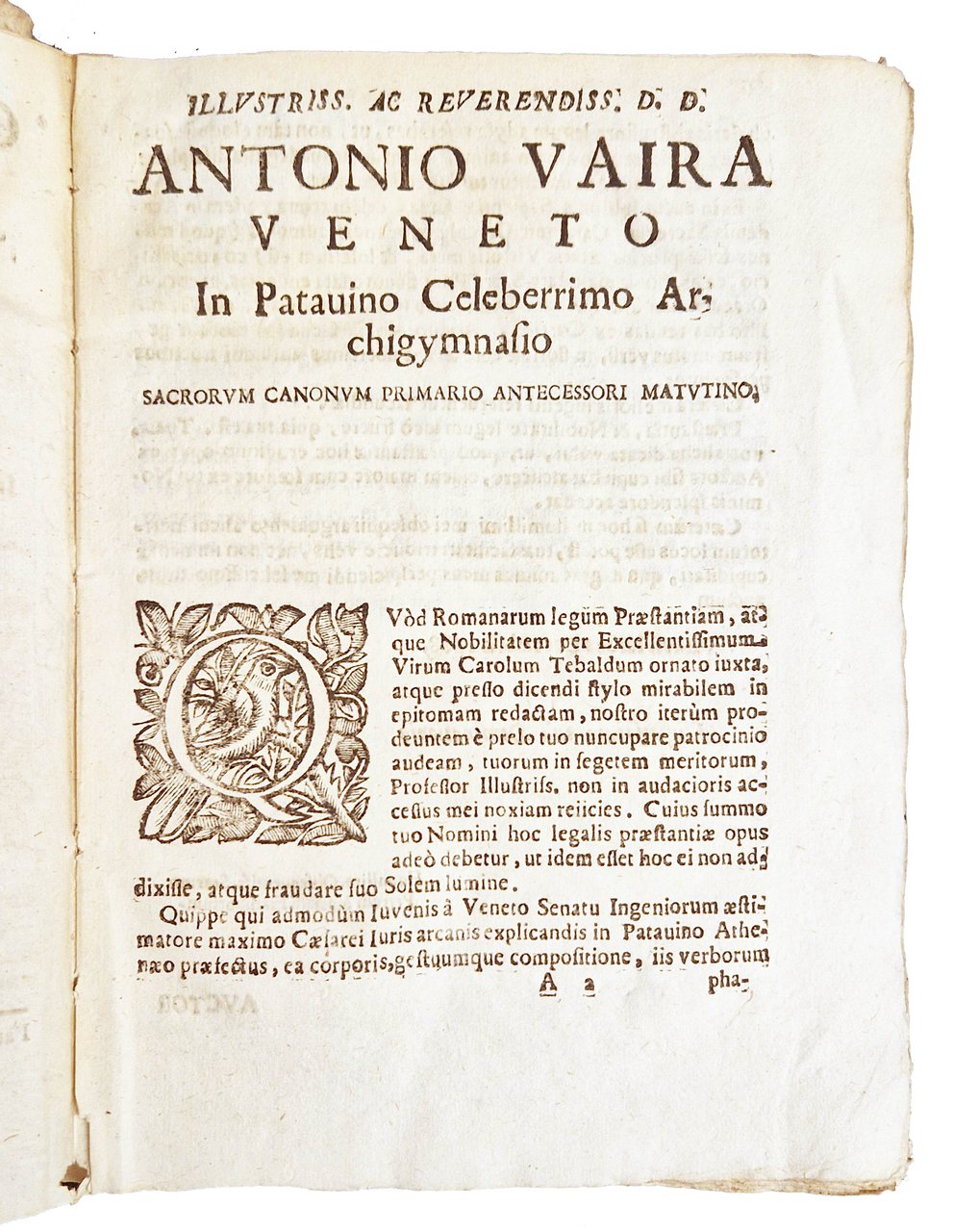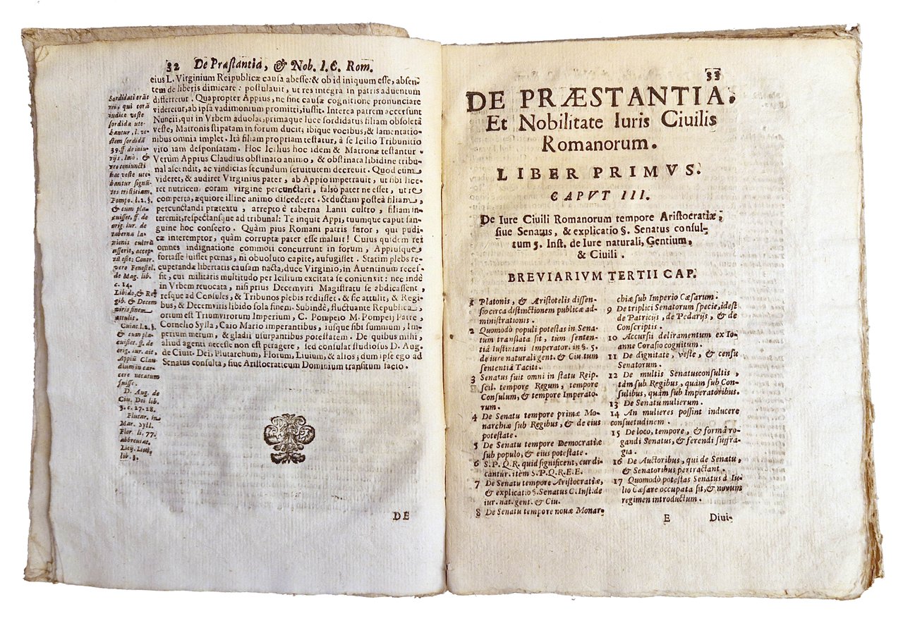 in-4°, 220x164 mm, leg. in cartonato grezzo coevo; pp. [8], 293, [15]. Marca xilografica al frontespizio (Minerva tende il braccio destro verso un ulivo e tiene con la sinistra lo scudo, in una cornice figurata; in alto iniziali PMF; motto su nastro: Pacis opus). Iniziali e finalini xilografici. Caratteri: romano, corsivo. Seconda edizione di questa interessante disamina di carattere giuridico sulla "eccellenza e nobiltà del diritto civile dei Romani", volta a evidenziarne la validità ed attualità "contro coloro che falsamente pensano che il diritto civile dei Romani, giunto già alla vecchiaia, sia privo di forza". Rif.: IT\ICCU\BVEE\055114. OCLC, 797699638. Cond.: Segno d'uso alla legatura (titolo sbiadito al dorso, piccola spaccatura in corrispondenza della cerniera anteriore, leggera lentezza della legatura). Carte in barbe, occasionali bruniture, piccoli strappi marginali ad alcune carte, senza perdite di testo; aloni d'umido ad alcune carte. Esemplare in buone condizioni generali.