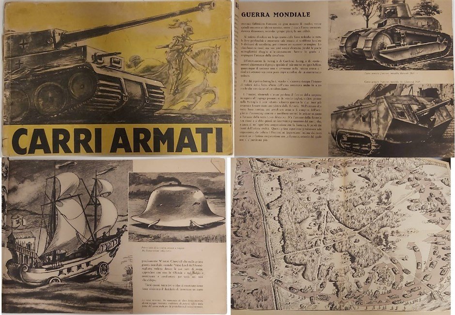 album in-8 obl., ccnn 32, bross. edit. Al fine gr. tav. rip. a colori raffigurante lo schema illustrativo di una “battaglia di annientamento”. Decine di tavv. che illustrano le varie tipologie di carri tedeschi impiegati nei vari campi. Un capitolo è dedicato alla storia dei primi carri e alla loro produzione. Raro. Dorso mancante e restauro alla tav. final., bell’esempl. [231]