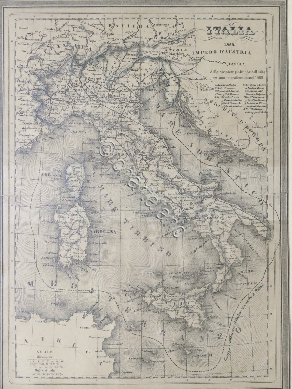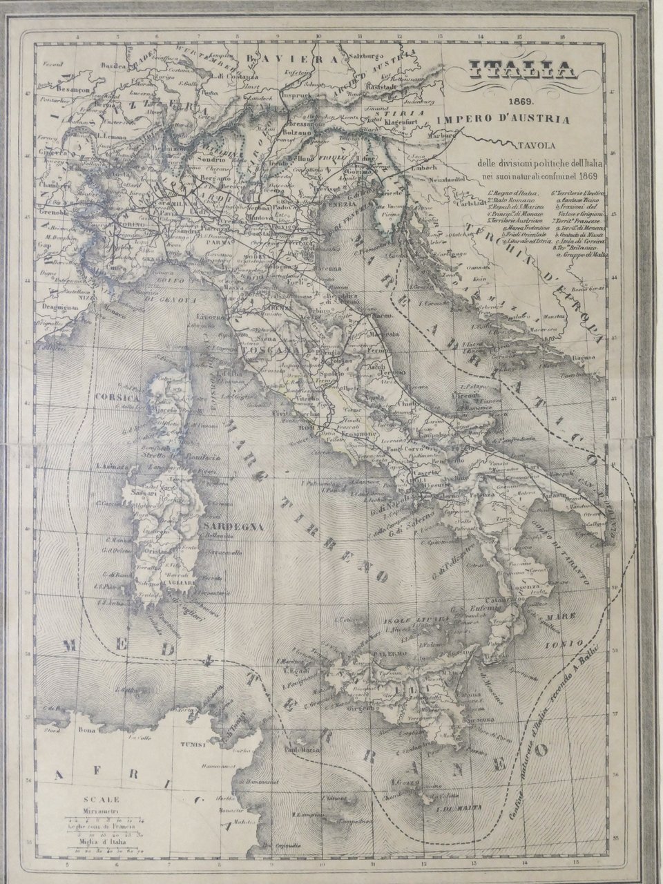 Carta geografica d'Italia - Tavola delle divisioni politiche nei suoi naturali confini - ed. 1869 Dimensioni carta: 22 x 30 cm ca. Cornice in legno e vetro di protezione. Condizioni molto buone.