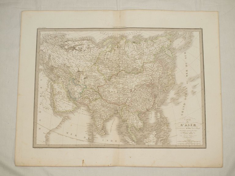 Mappa di grandi dimensioni colorata a mano del 1832 dell'Asia. Autore: Lapie M. (Pierre) (1779-1850) Atlante: Atlas universel de geographie ancienne et moderne Data: 1832 Tecnica: Acquaforte Dimensione del foglio: 66x52 cm Dimensione incisione: 61x45 Condizioni: Ottime. Rare fioriture. Piegatura verticale.Coloured map of Asia, big size, coloured by hand. Author: Lapie M. (Pierre) (1779-1850) Atlas: Atlas universel de geographie ancienne et moderne Date: 1832 Technique: etching on steel Leaf Dimension: 66x52 cm (25.98x20.47 inches) Engraving Dimension: 61x45 cm (24x17.72 inches) Conditions: Very Good conditions. Vertical folding of the page.