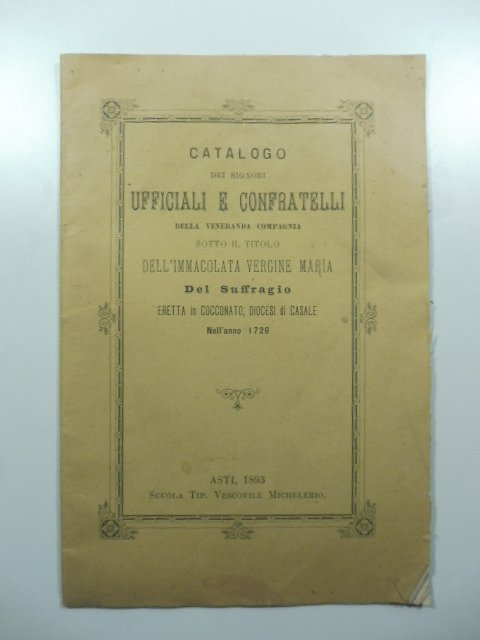 Catalogo dei Signori Ufficiali e confratelli della veneranda Compagnia sotto il titolo dell'Immacolata Vergine Maria del Suffragio eretta in Cocconato, diocesi di Casale nell'anno 1726