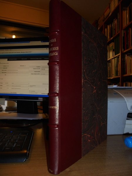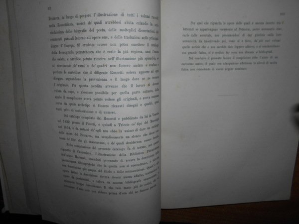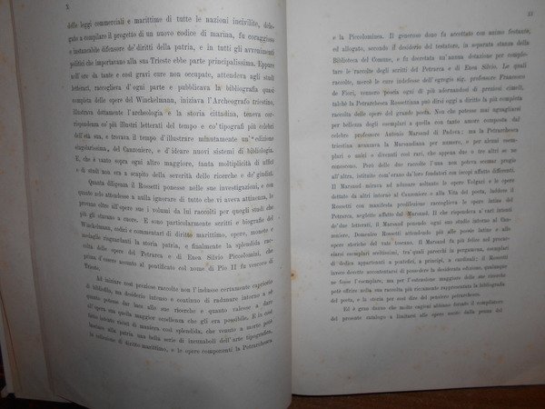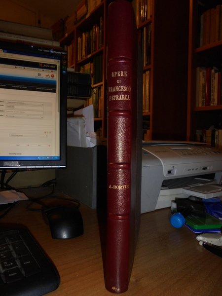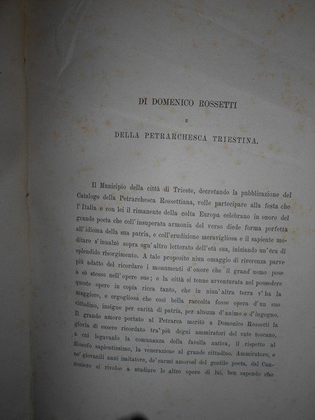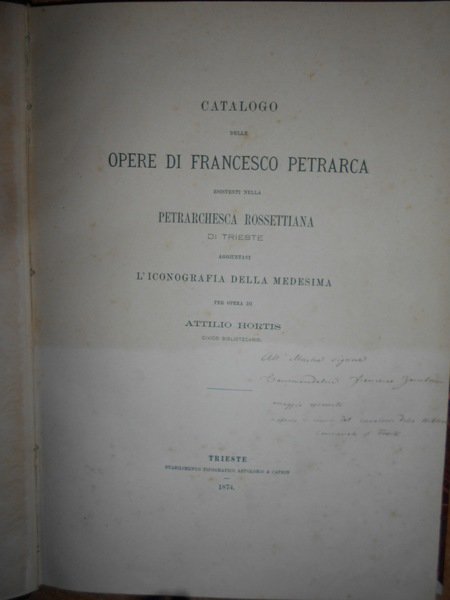 Per opera di Attilio Hortis. Trieste, Stabilimento Tipografico Appolonio & Caprin, 1874. Catalogo delle Opere di Francesco Petrarca esistenti nella Petrarchesca Rossettiana di Trieste aggiuntavi l' iconografia della medesima. Edizione originale. In-4° piccolo, m-pelle, dorso a nervi e titoli in oro. xiii, 215, (2) pp., ritratto di Rossetti in antiporta e tre tavole in cartoncino fuori testo protette da veline. Ottimo esemplare. Neg. mob. 2 dietro