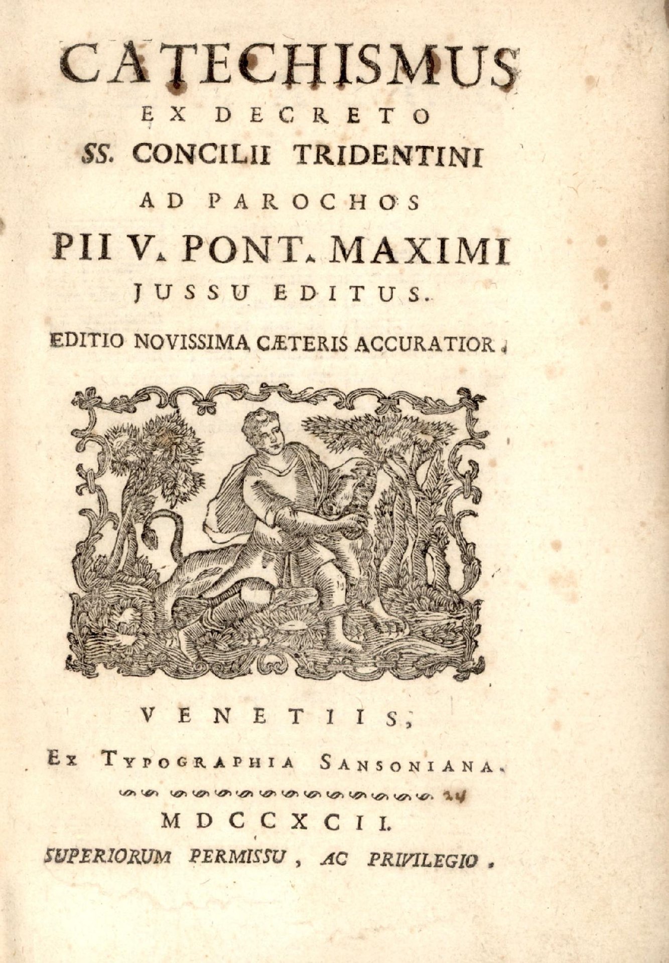 Catechismus ex decreto ss. Concilii Tridentini ad parochos Pii 5. pont. maximi jussu editu. xvi, 432 p. ; 8° Vignetta xilografica al frontespizio. Ampia mancanza nel dorso. Evidenti segni d'uso. Legatura in buone condizioni. 200 - Ba Mediocre (Poor)