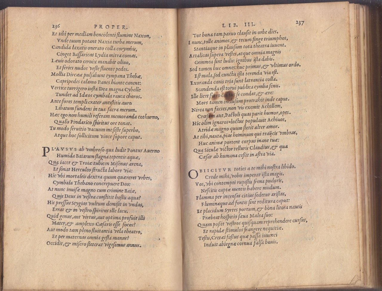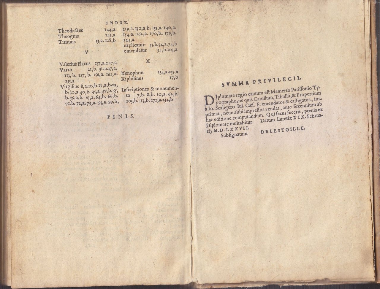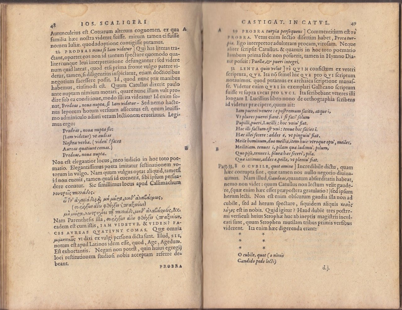 Prima edizione della celebre e più volte ristampata edizione di Catullo Tibullo e Properzio, curata dallo studioso francese Joseph Justus Scalinger (1549-1609), uno dei più influenti studiosi classici del Rinascimento. Il Catullo di Scalinger divenne il testo definitivo del grande poeta lirico e, come molte delle opere di Scalinger, un modello per cultura classica.