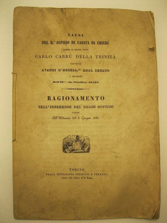 Causa del Ro Ospizio di carita' di Chieri contro il signor conte Carlo Carru' della trinita', vertente avanti l'eccell. mo Real Senato, a relazione dell'ill. mo sig. Cavaliere Agne's Ragionamento nell'interesse del Regio Ospizio letto all'Udienza del 3 giugno 1845