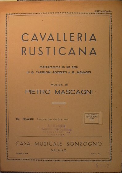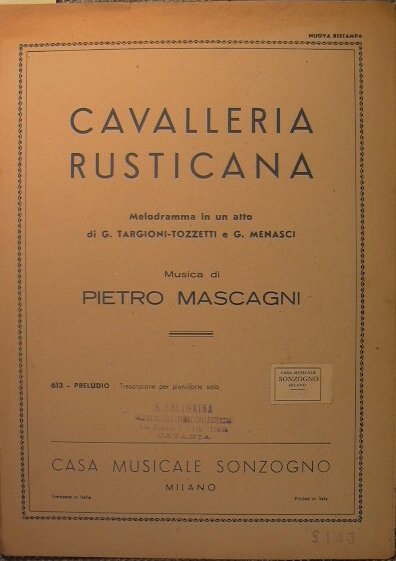 Preludio - Melodramma in un atto di G. Targioni - Tozzetti e G. Menasci - in 4° - pp.9 - Brossura editoriale - Timbro e nota a matita alla brossura. Strappetti ai margini - Trascrizione per pianoforte solo. N.P. 613