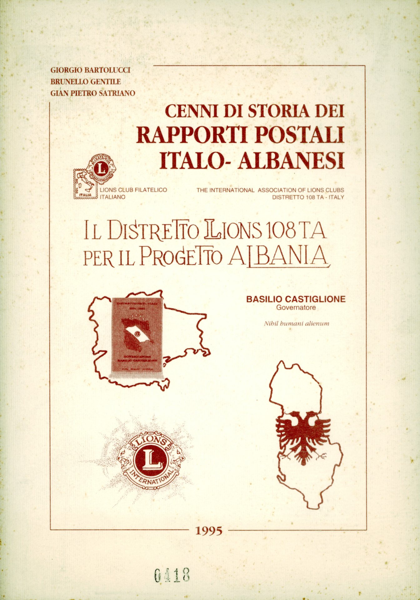 Testi di Giorgio Bartolucci, Brunello Gentile, Gian ietro Satriano. Il distretto Lions 108 TA per il progetto Albania. 60 p. : ill. in nero f.t. 24 cm. 380 -Ba Buono (Good)