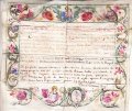 Miniatura su pergamena acquerellata con motivi floreali e figure di santi, mm 177 x 200. Certificato di battesimo Bergamo 1700.