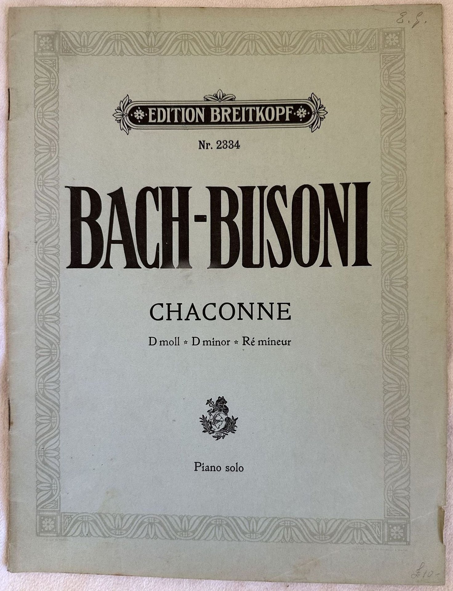 Edizione del 1902 della melodia "Chaconne D Moll" di Johann Sebastian Bach (1685-1750)" rivista da Ferruccio Busoni. In ottime condizioni. Copertina editoriale in ottime condizioni con lievi usure marginali. Legatura in buone condizioni. Pagine in ottime condizioni con rare fioriture.In folio. cm. 30,5x23. Pp. 19.Edition of 1902 of the melody "Chaconne D Moll" by Johann Sebastian Bach (1685-1750)" reviewed by Ferruccio Busoni. In very good condition Editorial cover in very good conditions lightly worn in the extremities. Binding in good conditions. Pages in very good conditions with occasional foxing. In folio. cm. 30,5x23. Pp. 19.