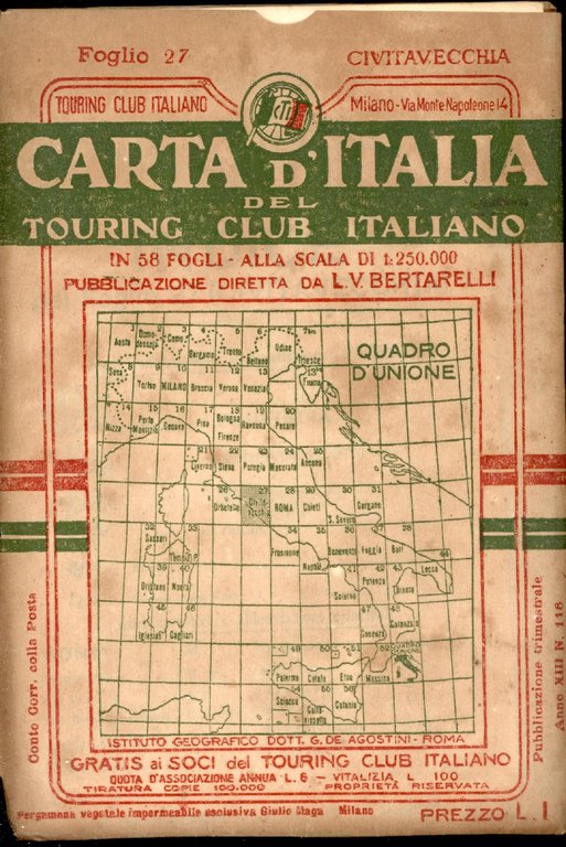 Foglio 27 - Civitavecchia. Con custodia originale in pergamena vegetale. Allegato fascicolo con indice delle località contenute nella carta e legenda dei segni convenzionali. Stampa a colori. Scala 1:250.000. 914.5 - Ba Ottimo (Fine)