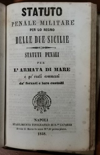 STATUTO PENALE MILITARE per lo regno delle Due Sicilie, statuti penali per l'armata di mare e pe' reati commessi da' forzati e loro custodi.