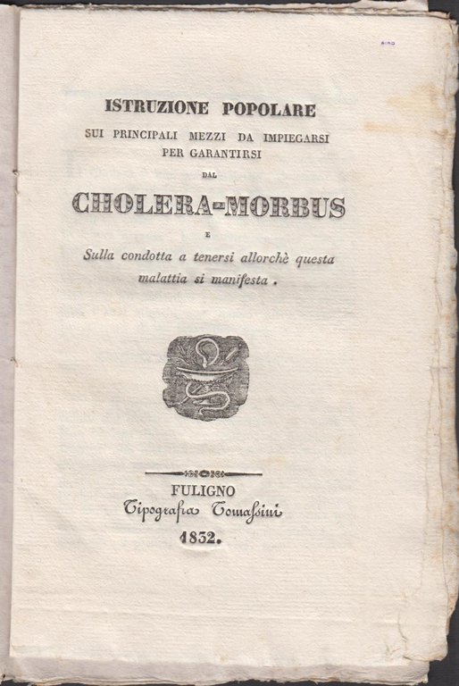 Colera Istruzione Popolare sui principali mezzi da impiegarsi per garantirsi dal colera morbus Tip. Tomassini Foligno 1832
