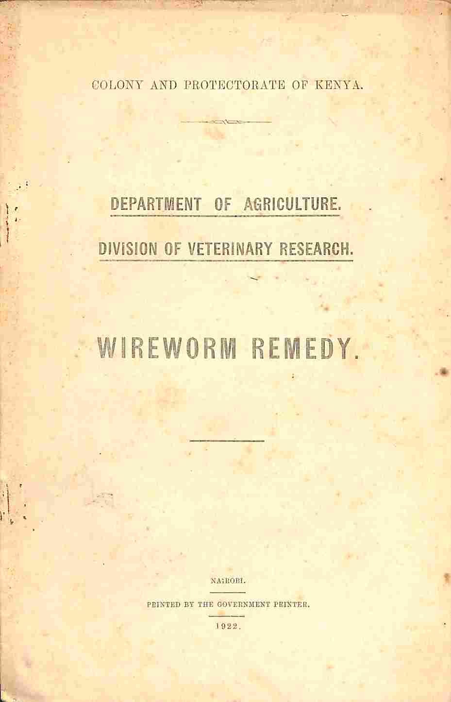 Colony and Protectorate of Kenya. Department of Agriculture. Division of Veterinary Research. Wireworm Remedy