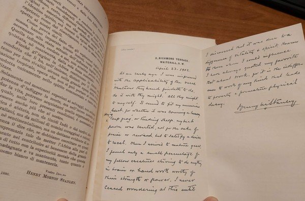 2 voll. in-8, pp. XX, 577 (num. cont.), leg. mod. m. tela edit. con tit. al d. e ai piatti. Con 16 tavv. anche ripp., un fac-simile e una carta geogr. rip. Henry Morton Stanley (1841 - 1904), giornalista ed esploratore del XIX secolo, di nazionalità statunitense ma gallese di nascita, famoso per le sue esplorazioni africane e per la sua ricerca di David Livingstone. [329]