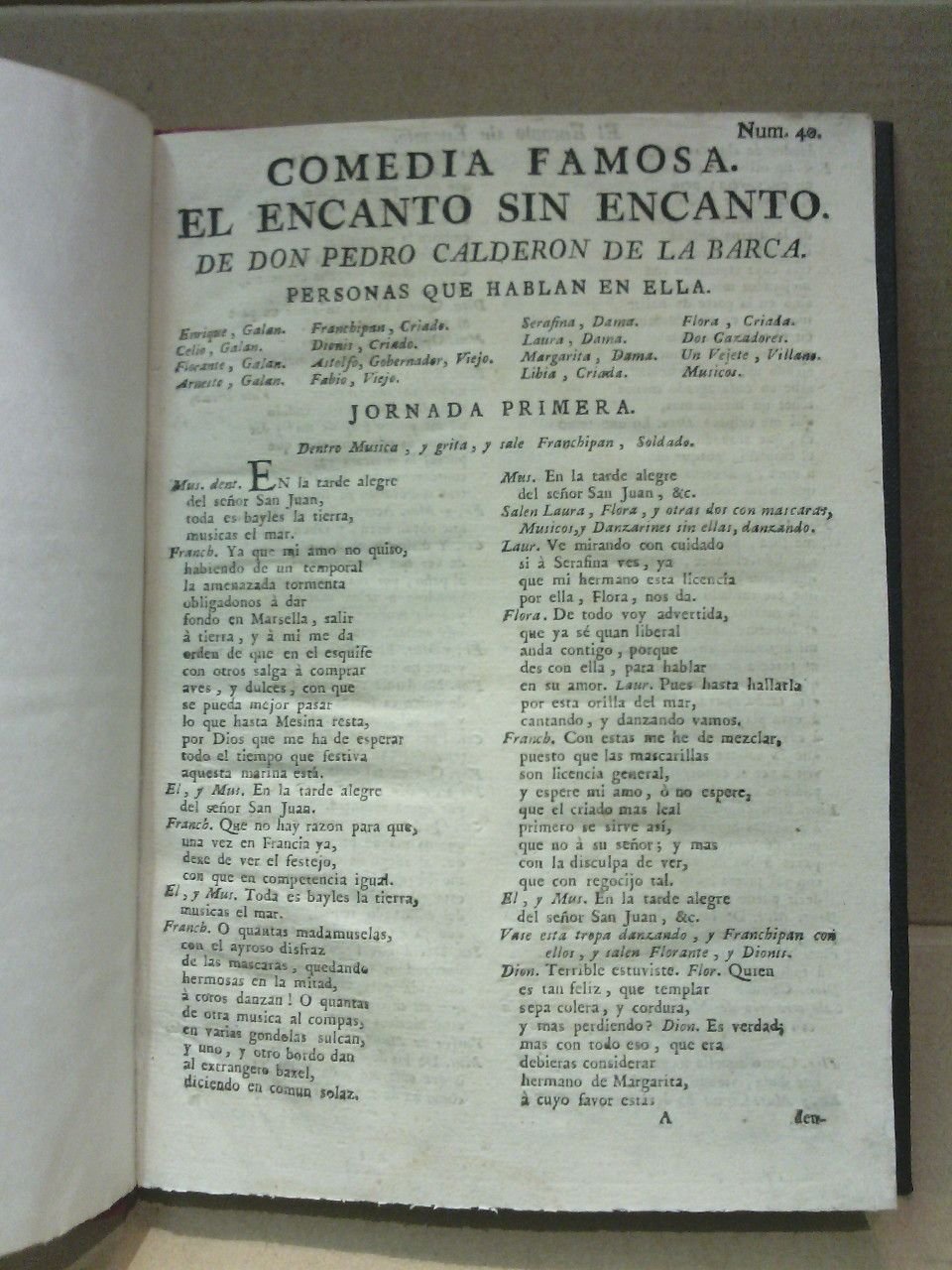 Barcelona: Por Francisco Suria y Burgada, Impresor, [ca. 1785].- [18 h.] impresas por ambas caras a dos columnas; 4º menor (22 x 15,6 cm.); Media Piel Nueva.- (Comedia Famosa. Nº 40).* TEATRO ESPAÑOL DESDE SUS ORÍGENES HASTA EL SIGLO XVIII