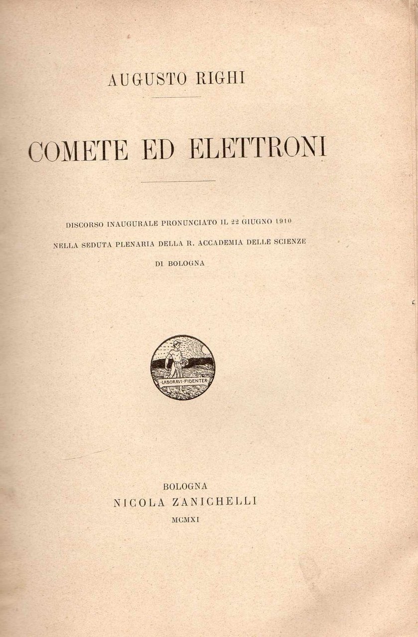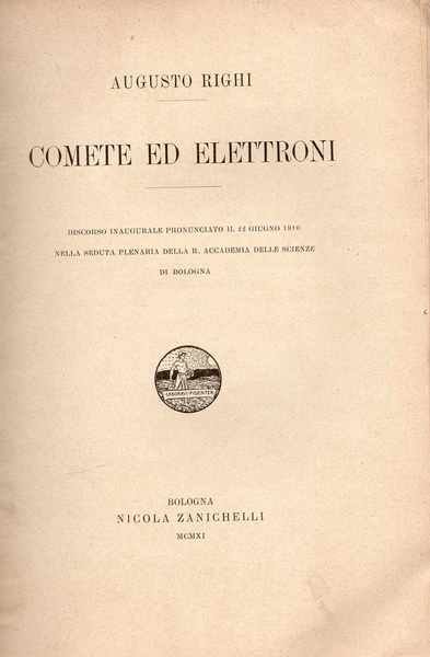 Comete ed elettroni - Discorso inaugurale pronunciato il 22 giugno 1910 nella seduta plenaria della R. accademia delle scienze di Bologna