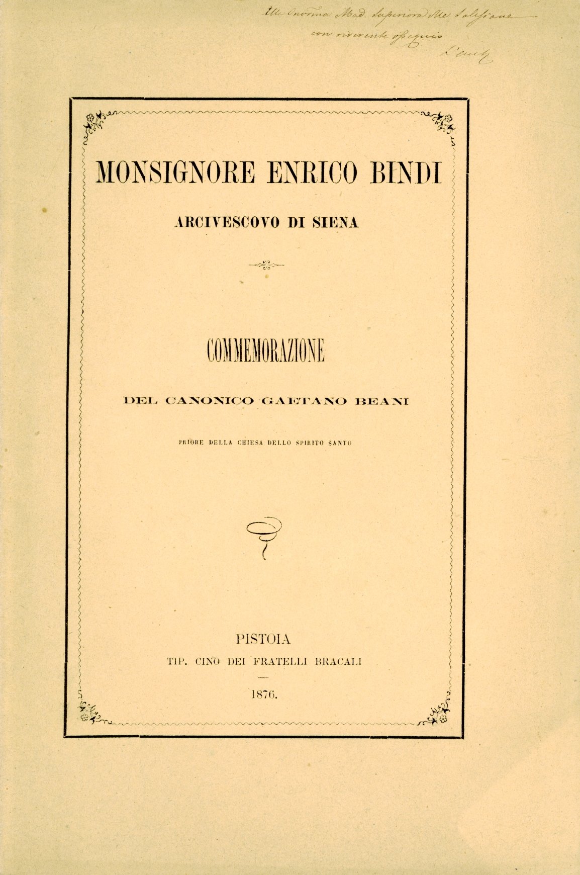 37 p. ; 23 cm Monsignore Enrico Bindi era arcivescovo di Siena 920 - Ba Ottimo (Fine)