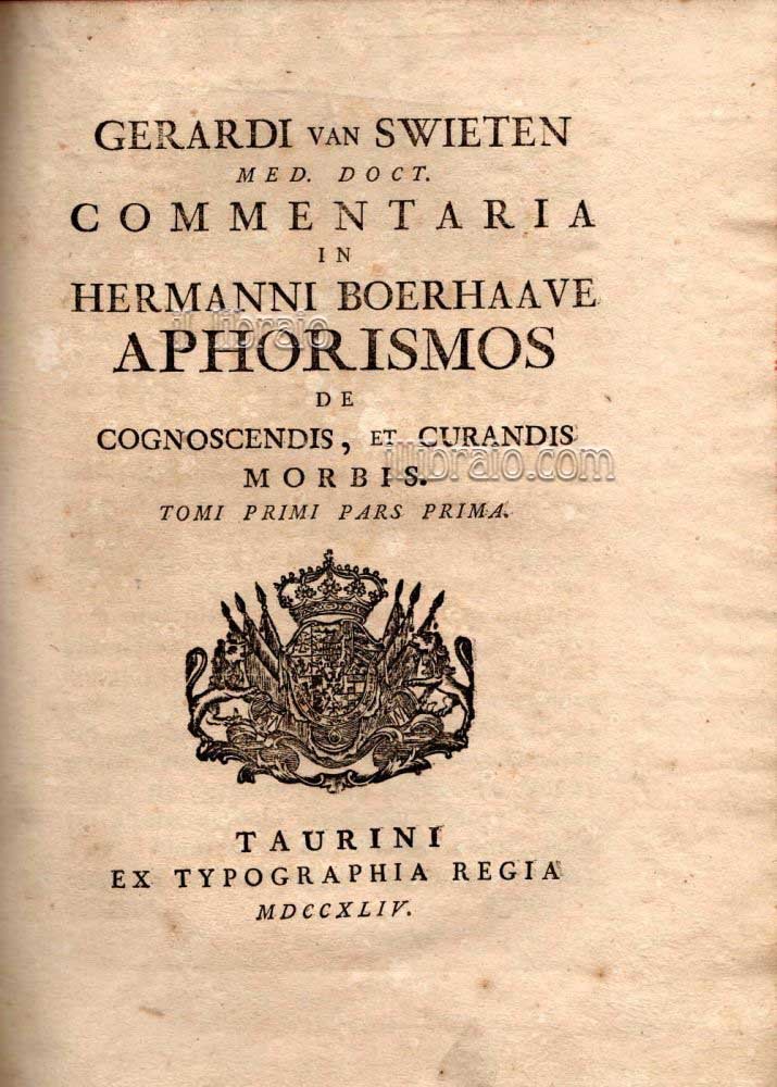 5 tomi in 10 voll.; in 8°; pp. (14), 535, (3) - (6), 537-956, (1) - (6), 411, (3) - (6,) 413-811, (3) - (10), 348, (2) - (6), 349-684, (2) - (6), 392, (2) - (6), 393-751, (3) - (1), VIII, 371, (3) - (6), 396, (1); leg. in piena pergamena coeva con tit. e fregi oro al dorso. Tagli a spruzzo; fregi tipogr. ai frontespizi. Amplissimo indice degli autori e delle materie in fine dell'ultimo volume. Alla fine del vol. V pars II: "Libellus de Materie Medica et remediorum formulis, quae serviunt aphorismis de cognoscendis et curandis morbis", pp. 94 (4) (la prefazione in questo 'Libellus de materie medica’ è datata 11 febbraio 1719). Edizione torinese del monumentale commento di Gerard van Swieten agli aforismi medici di Hermann Boerhaave ("Aphorismi de cognoscendis et de curandis morbis", Leyden, 1709), uscito a Leida tra il 1745 e il 1772 e tradotto nelle principali lingue europee. Esso costituisce il più significativo documento del nuovo ippocratismo che ebbe il suo centro principale a Vienna. Boerhave (Voorhout, 1668-Leida, 1782), medico e scienziato tra i principali del suo tempo, cercò di conciliare l'ippocratismo con i principi della iatrochimica e della iatromeccanica. Nella sua vastissima opera si occupò anche di chimica e di botanica. Gerard Van Swieten (Leida, 1700 Vienna, 1782), insigne medico olandese, fu tra i fondatori della Scuola di Medicina di Vienna. Allievo del Boerhaave in gioventù, fu tra l'altro medico di corte di Maria Teresa. Il suo nome resta legato anche al cosiddetto "liquore di Van Swieden", che egli prescrisse per la cura della sifilide. I capitoli sulle febbri, sulla sifilide, sugli esantemi sono dei capolavori. Così il Major: "Storia della Medicina": II, pag. 518. Ma, oltre le malattie indicate, il Van Swieten tratta di: emorragie, convulsioni, ferite alla testa, diarree, vomiti, angine, pleuriti, epatiti, nefriti, malattie croniche, paralisi, epilessie, melanconia, manie varie, rabbia canina, scorbuto, tisi, idropie, ginecologia (parti difficili), vaiolo, ecc. Cfr. Fondo Olschki, V, 1081 (ed. del 1755 e del 1771-73). Graesse, VII, 257. Wellcome, II, p. 192